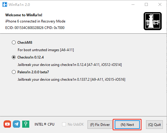 2. Attiva l’opzione Checkra1n 0.12.4 e fai clic su Avanti. Questo avvierà l’attivazione della modalità di ripristino sul dispositivo iOS collegato.