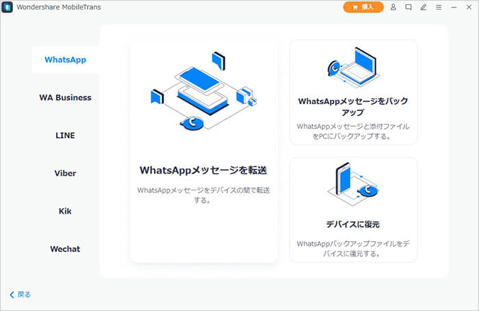 このツールはWhatsAppメッセージ全体をPC、外付けハードドライブ、USBフラッシュドライブにバックアップすることができます。また、必要なときにバックアップをiPhoneに復元することを選択できます。以下は、iPhoneからPCにWhatsAppチャットをエクスポートする手順です。