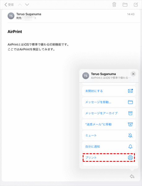 ステップ 5. パソコンで受信したメールを開く>「共有」ボタンをタップ>「プリント」オプションを選択します。AirPrint対応のプリンターをお持ちでない場合は、パソコンでメールを確認し、パソコンから印刷することができます。