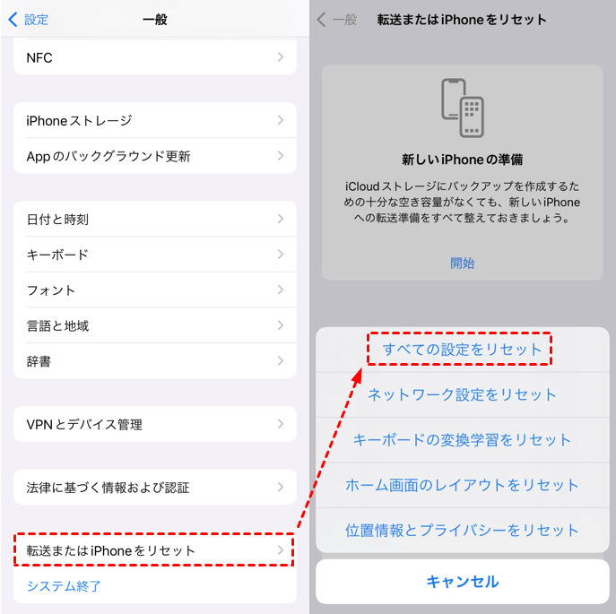 「設定」>「一般」>「転送またはiPhoneをリセット」>「リセット」を選択>「すべての設定をリセット」を選択します。操作確認のため、パスワードを入力する必要があります。