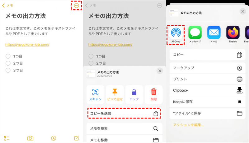 ステップ 2. ソースiPhoneで、メモアプリに向かう>送信する必要があるメモをクリック>三点アイコンをクリック>「コピーを送信」をタップ>「AirDrop」をタップ>ターゲットiCloudアカウントをタップします。