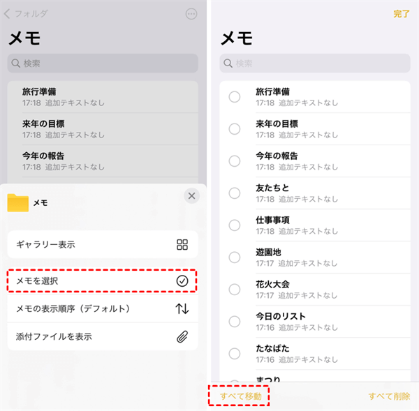 ステップ 2. メモアプリに移動>メニューアイコンをクリック>「メモを選択」をタップ>転送する必要があるメモを選択するか、「すべて移動」をタップ>「iPhone上で」の下のフォルダに移動させます。