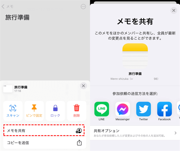 ステップ 2. 三点アイコン>「メモを共有」をタップ>参加依頼の送信方法を選択します。
