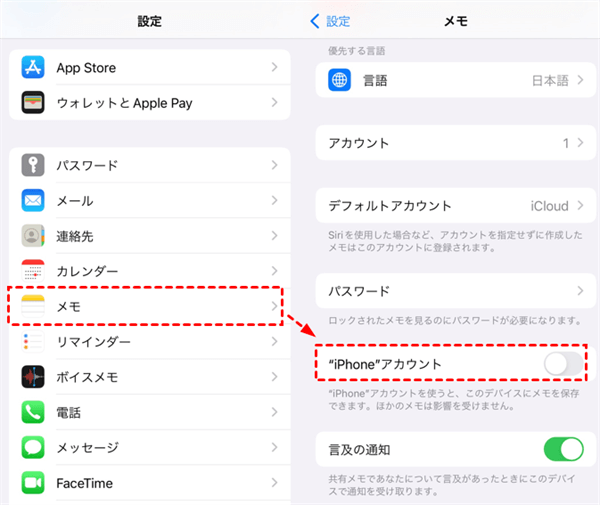 ステップ 1. ソースiCloudアカウントにログイン>WiFiまたはモバイル通信データを切断>「設定」>「メモ」>「“iPhone”アカウント」を有効にします。