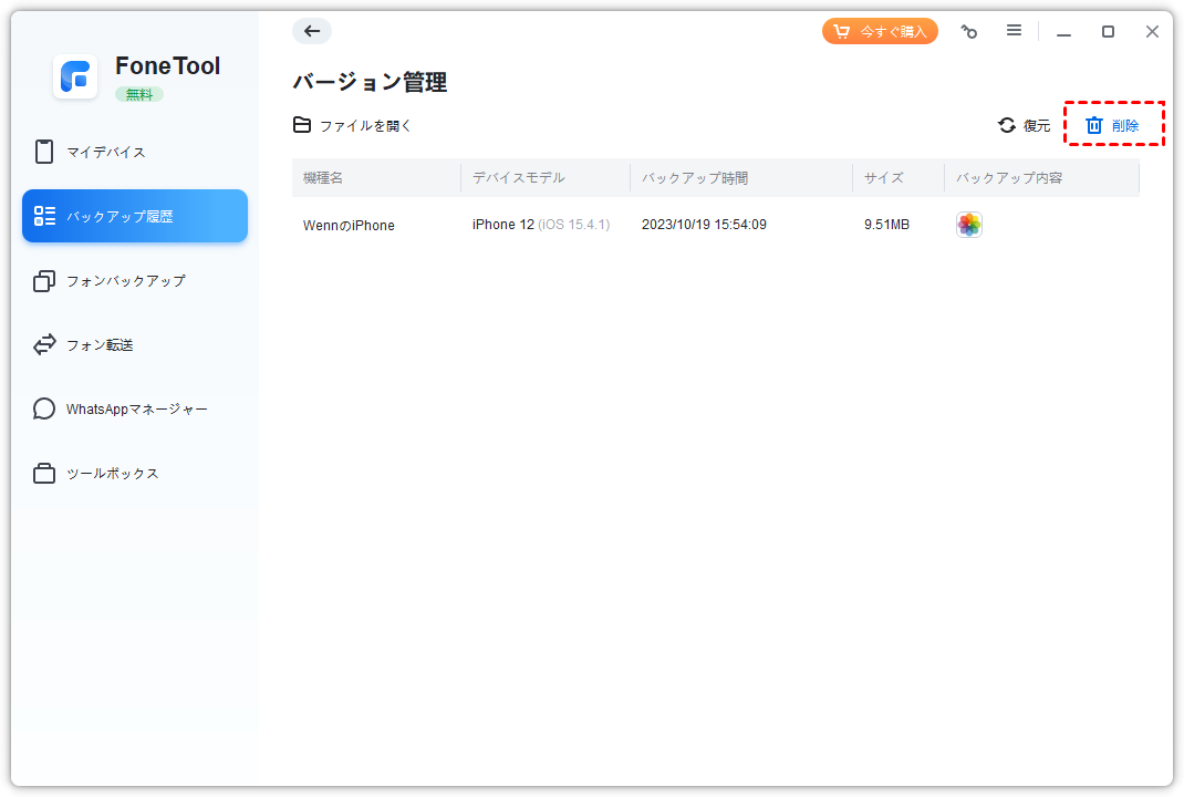 タスクの「削除」ボタンをクリックして、デバイスのすべてのバックアップバージョンを削除します。この機能は、対応するファイルを削除せずに、すべてのバックアップバージョンのみを削除します。この場合、必要に応じてファイルをプログラムにインポートできます。