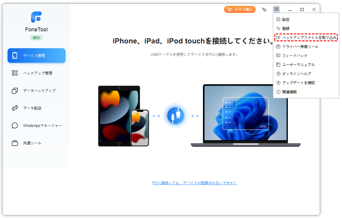 メインウィンドウの右上にある三本線をクリックし、「バックアップファイルを取り込む」を選択し、バックアップリポジトリファイル「mblibrary.db」を参照して選択すると、タスクと対応するバックアップバージョンがFoneToolにインポートされます。その後、タスクに基づいてバックアップを続行できます。