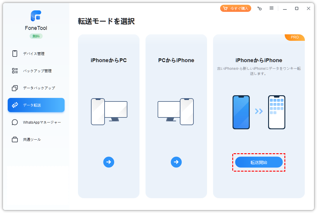 ステップ1:「データ転送」をクリックして、「iPhoneからiPhone」アイコンにマウスオーバーして、「転送開始」をクリックします。