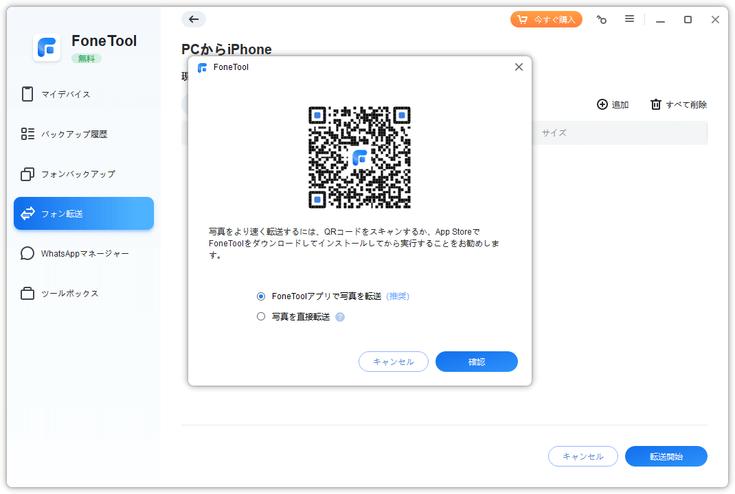 FoneToolは写真をiPhoneに転送する2つの方法を提供しています:最初の方法は、FoneToolアプリの助けを借りて、PCからiPhoneに写真を転送することです、転送が完了した後、これらの写真は、iPhone上で削除したり、編集したりすることができます。2番目の方法は、直接iPhoneに写真を転送することです。この方法はFoneTool Appをインストールする必要はありませんが、iPhone上で写真を削除したり編集したりすることはできません。つ目の方法はiTunesの「写真を同期」機能に似ています。この機能を使用した場合、iTunesによってiPhoneに同期された写真をiPhone上で削除したり編集したりすることはできません。