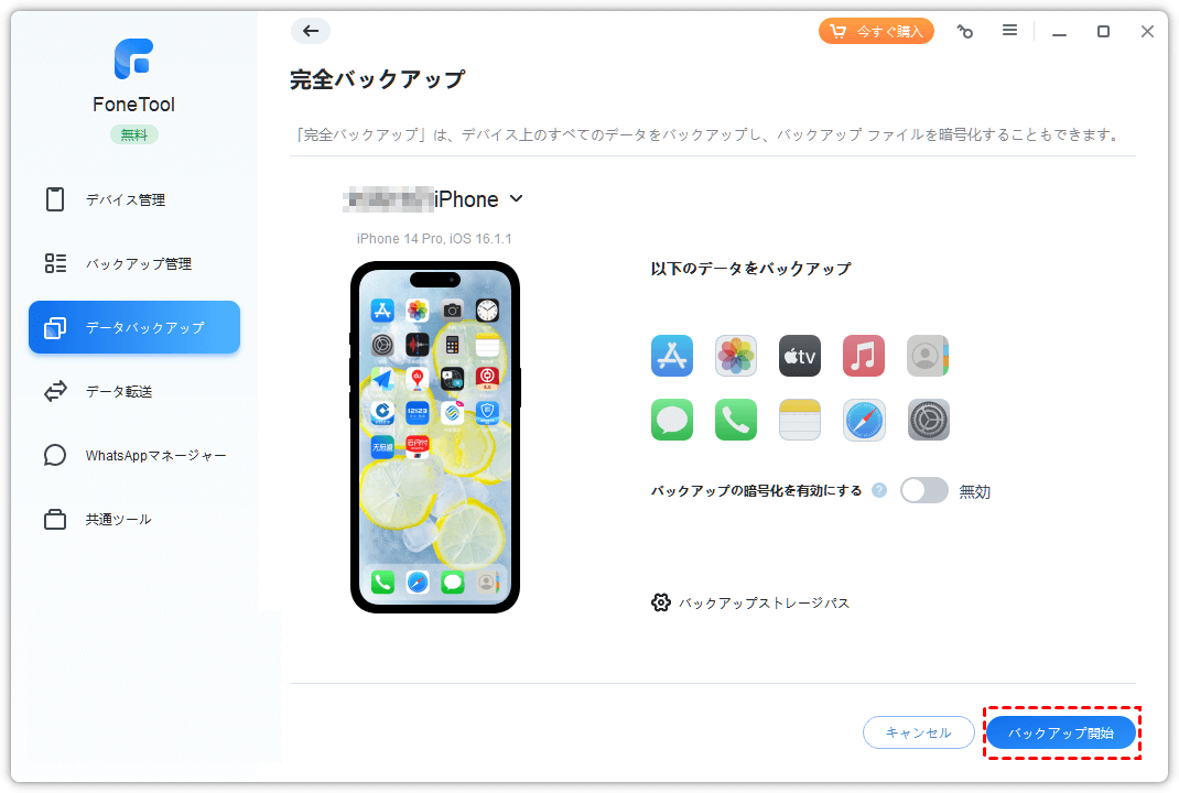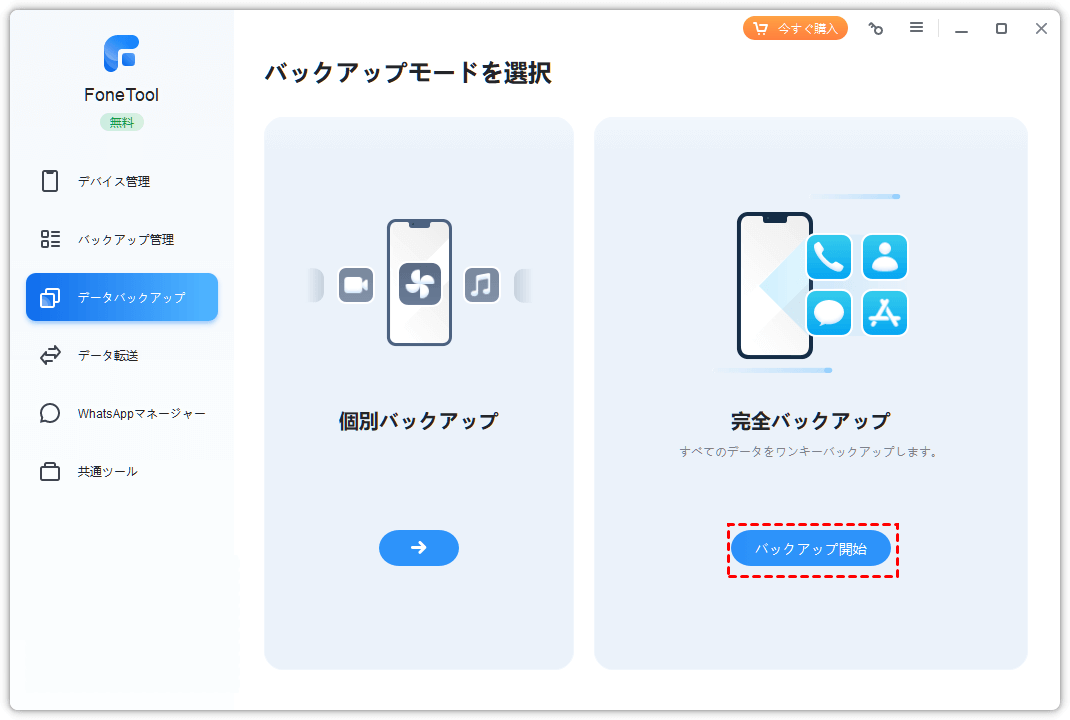 FoneToolを開き、データバックアップ -> 完全バックアップ -> バックアップ開始をクリックします。