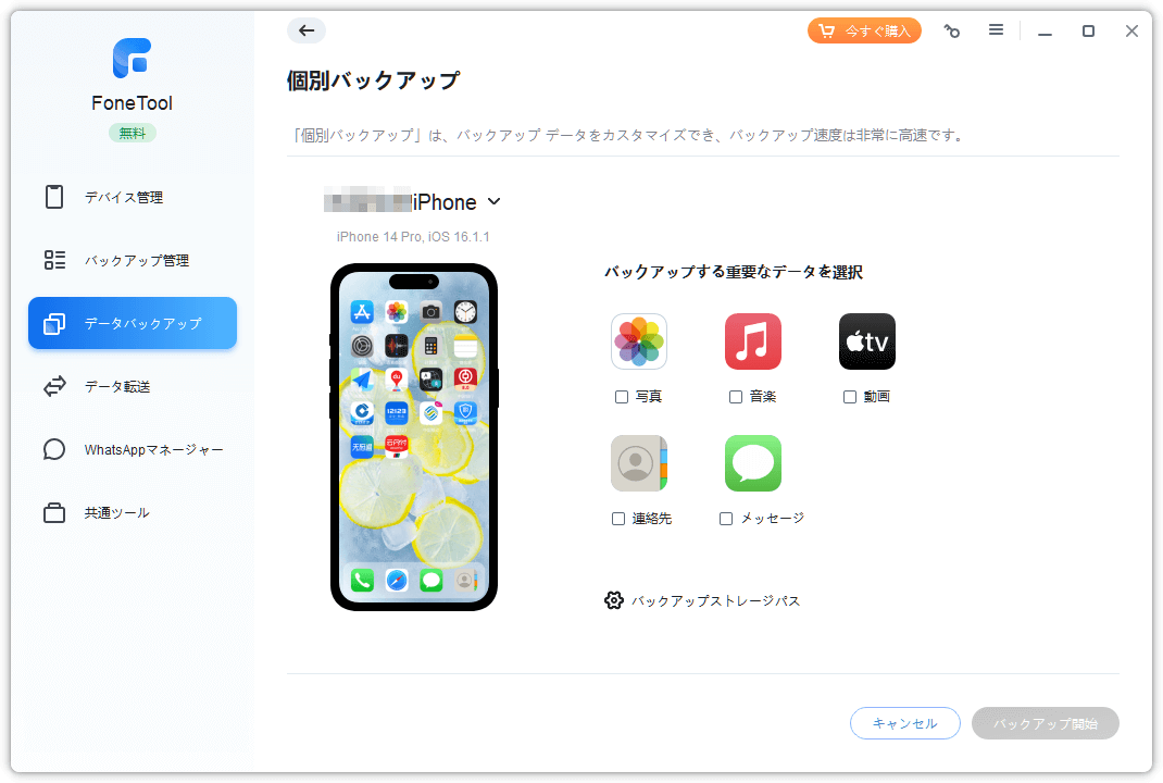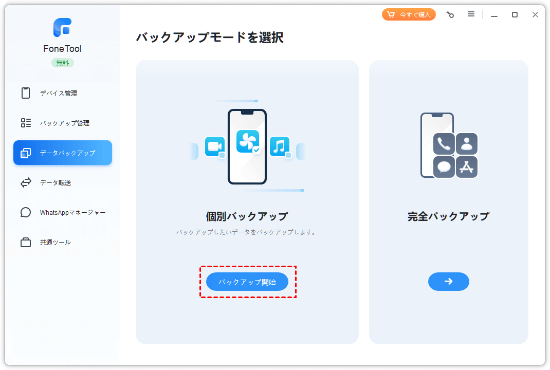FoneToolを開き、データバックアップ -> 個別バックアップ -> バックアップ開始をクリックします。