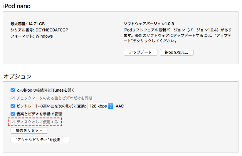 ステップ 2. iTunesを利用して音楽を同期していた場合、「概要」ページで「ディスクとして使用する」のチェックを外してください。その後、iTunesを終了します。