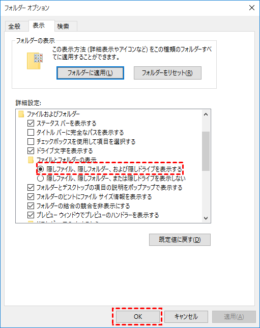 ステップ 4. ファイルエクスプローラのオプションウィンドウで、「表示」タブをクリックし、「隠しファイル、フォルダ、および隠しドライブを表示する」をチェック>「OK」をクリックして確定します。