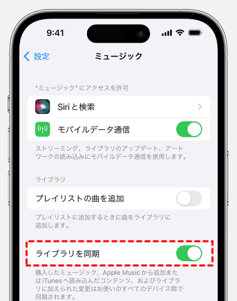 ステップ 3. 「ライブラリを同期」をオンにすると、iPhoneで追加した音楽は、iCloudミュージックライブラリを通じてiPod touchにも自動的に同期されます。