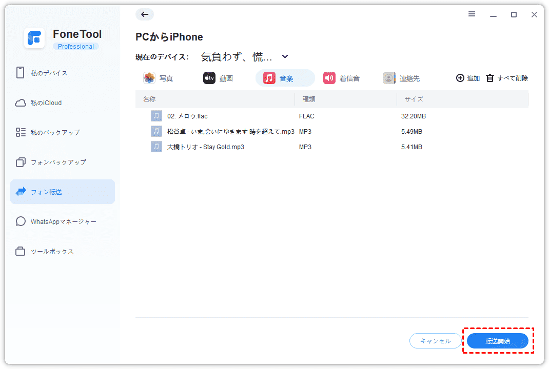 ステップ 5. iPhoneに追加される曲を確認>「転送開始」をクリックして開始します。