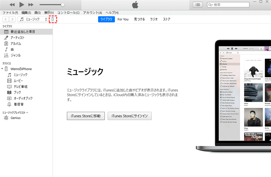 ステップ 2. iPhoneのUSBケーブルを使って、iPhoneとWindows 11を接続します。iTunesのインターフェースの左上付近にある「iPhone」ボタンをクリックします。