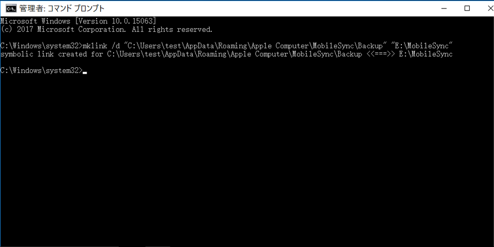 ステップ 2. 「Win」+「R」を押して、「ファイル名を指定して実行」のポップアップウィンドウで「cmd」を入力して「コマンドプロンプト」を開いてください。そして、コマンドを実行し、「mklink /J “C:\Users\\AppData\Roaming\Apple Computer\MobileSync\Backup” “E:\”」と入力します。