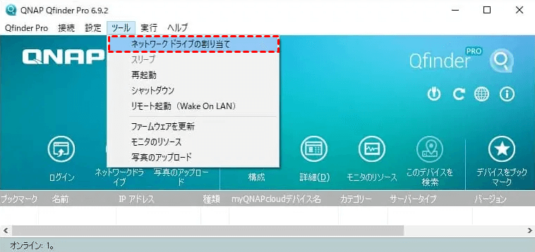 ステップ 3. Qfinder Proを起動し、NASを選択して「ツール」>「ネットワークドライブの割り当て」をクリックします。