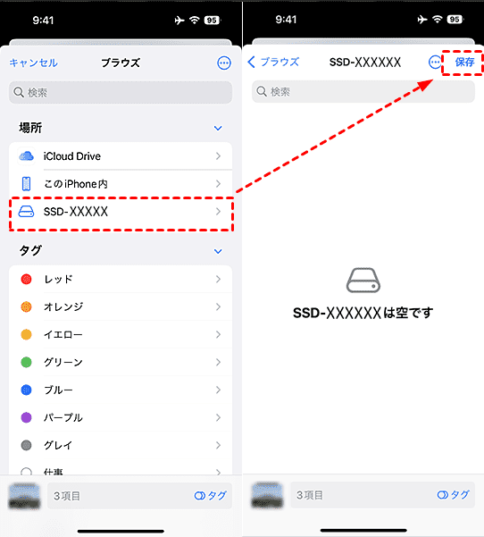 ステップ 3. 保存先はUSBメモリ(デバイス名)に選択して、「保存」をタップします。