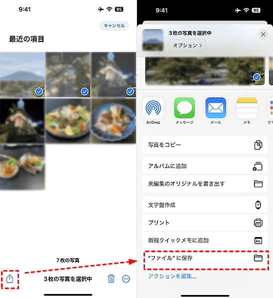 ステップ 2. バックアップしたいデータを開き、「共有(□に↑)」ボタンをタップし、共有オプションで「ファイルに保存」を選択します。
