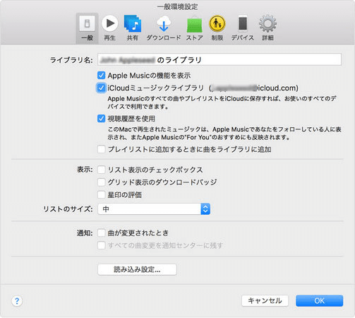 ● MacでApple Musicアプリを開き、「ミュージック」>「環境設定」を選択します。次に「一般」タブを開き、「iCloudミュージックライブラリ」オプションにチェックを入れます。「OK」をクリックします。