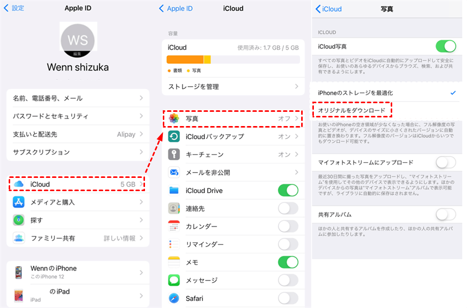 iCloudからiPhoneにオリジナルの写真をダウンロードするには:iPhoneの「設定」アプリにアクセス>「自分の名前」バナーをタップ>「iCloud」>「写真」>「iCloud写真」をタップ>「オリジナルをダウンロード」を選択します。