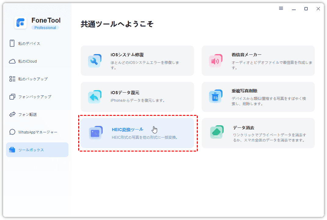 ステップ 1. FoneToolのサイドバーで「ツールボックス」をクリックし、「HEIC変換ツール」を選択します。