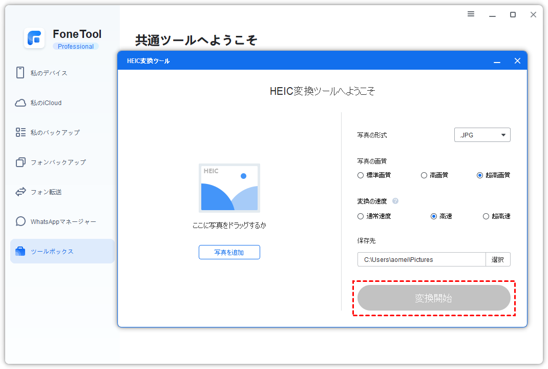 FoneToolのHEIC変換機能を使えば、HEICファイルを完全無料でJPEG/JPG形式に変換できます。その手順は以下になります。