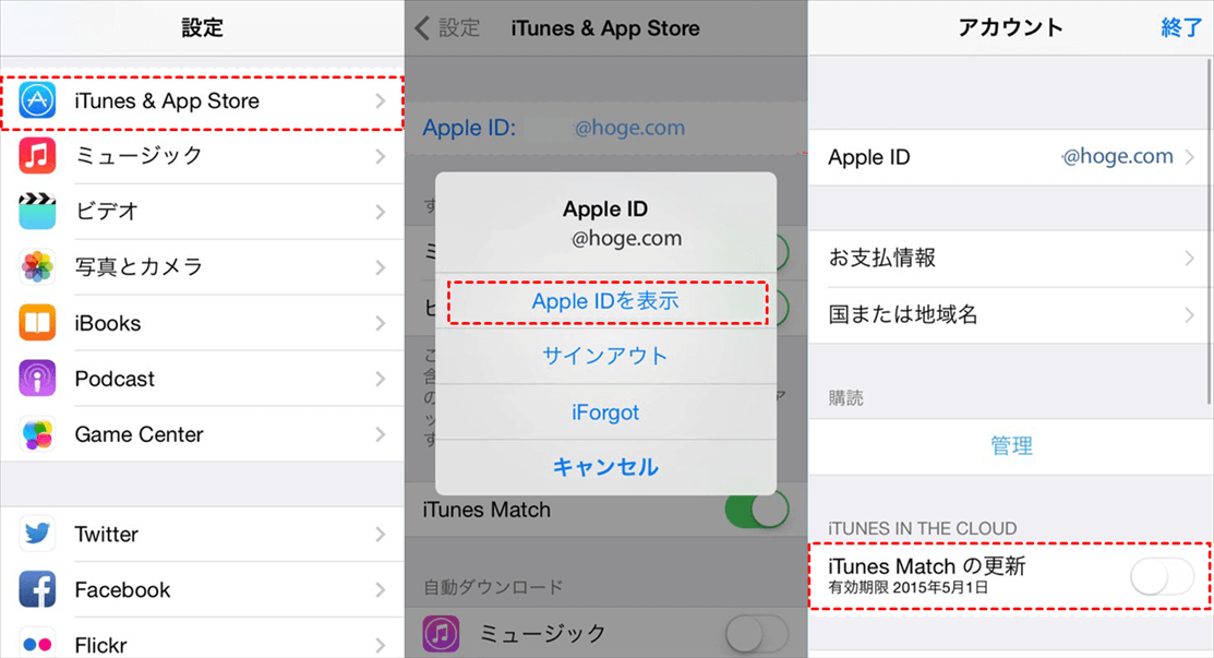 ● iPhoneで「設定」アプリ>「iTunes & App Store」をタップ>Apple IDを選択>「iTunes Matchの更新」をオフにします。