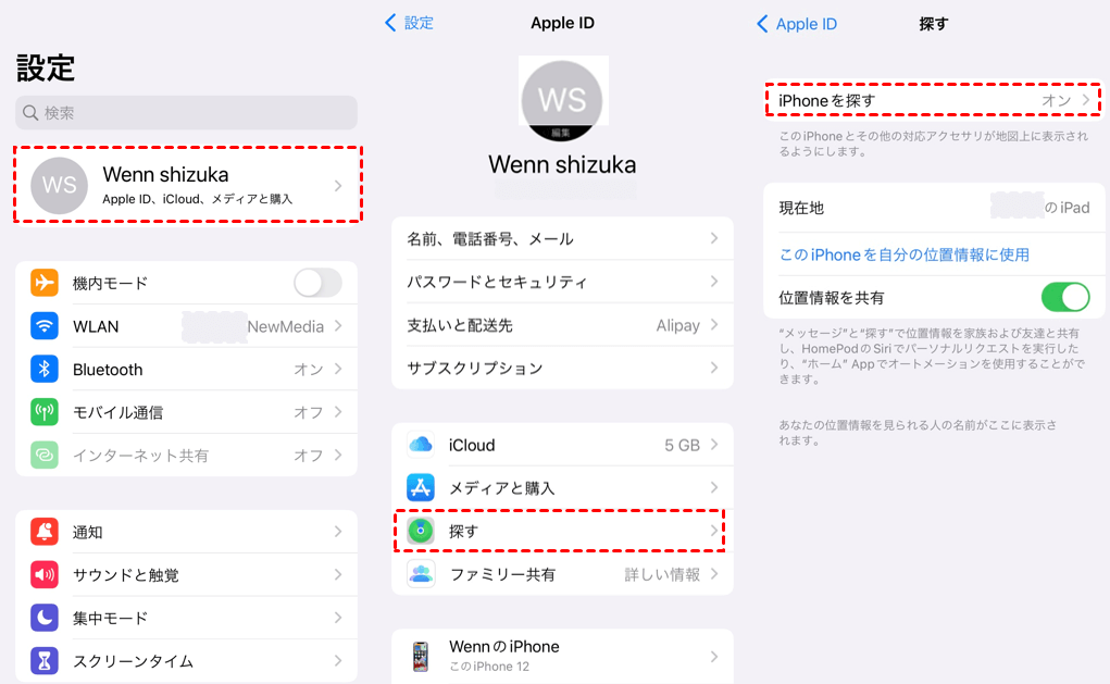 iPhoneの「設定」>「プロフィール」>「探す」>「iPhoneを探す」をタップして、スイッチをオフにします。