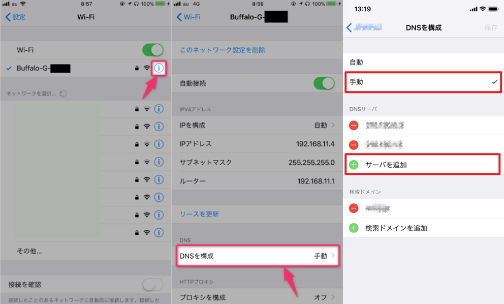 手順:「設定」>「Wi-Fi」>Wi-Fiの名前の横にある「i」ボタン>「DNSを構成」>「手動」>「サーバを追加」をタップします。