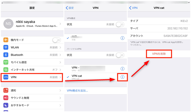 「設定」>「一般」>「VPN」>使用しているVPNの横の(i)アイコンをタップし、「VPNを削除」をタップします。