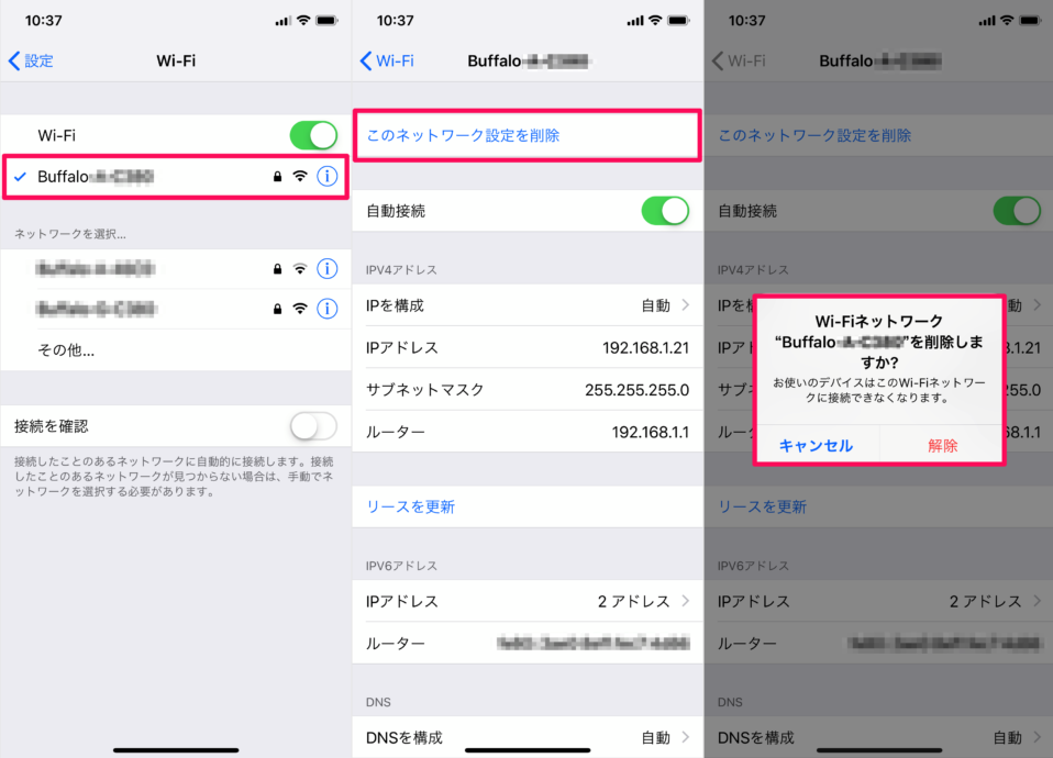 手順:「設定」>「Wi-Fi」をタップし、使用しているWi-Fiの名前の横にある「i」ボタンをタップし、「このネットワーク設定を削除」>「解除」をタップして確認します。デバイスを再起動し、削除されたWi-Fiに再度接続します。