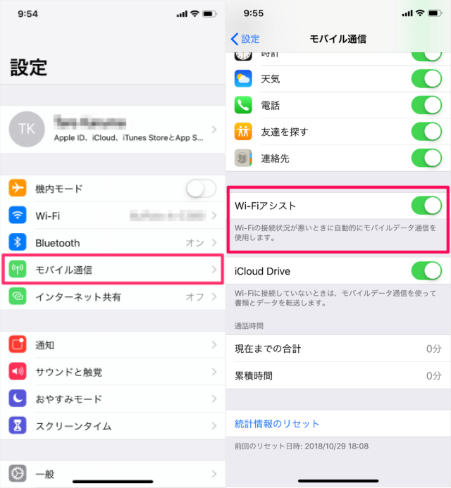 手順:「設定」>「モバイル通信」をタップして、「Wi-Fiアシスト」のスイッチをオフにして、数秒後に再びオンにします。