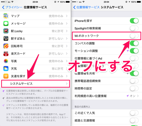 手順:「設定」>「プライバシー」>「位置情報サービス」>「システムサービス」をタップして、「Wi-Fiネットワーク」のスイッチをオフにします。問題が解決されたら、スイッチをオンにします。