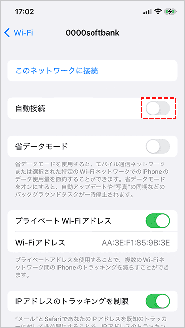 「自動接続」がオンになっているか確認し、オフの場合はオンに切り替えます。