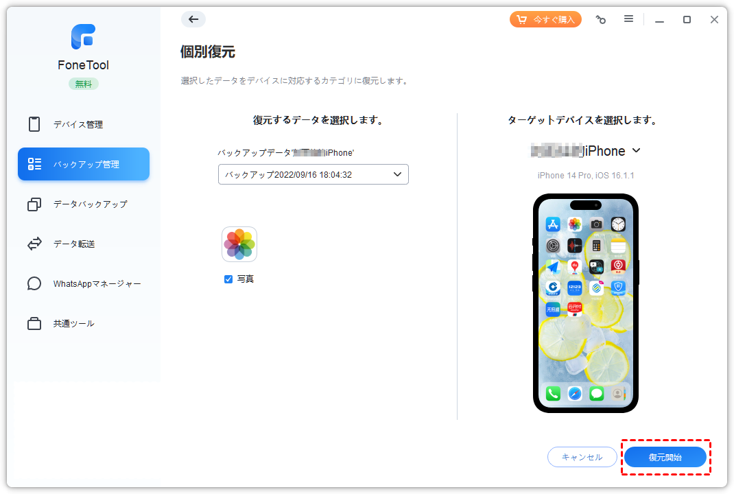ステップ 1. 別のApple IDがサインインしたデバイス/新しいApple IDに変更したデバイスをパソコンに接続し、FoneToolを開きます。「バックアップ管理」画面が表示され、復元したいバックアップを選択し、「復元」アイコンを選択します。