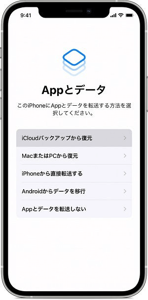 ステップ 1. 新しいiPhone 16の電源を入れる>「Appとデータ」画面が表示されるまで、画面上の初期設定プロセスに従う>「iCloudバックアップから復元」を選択します。