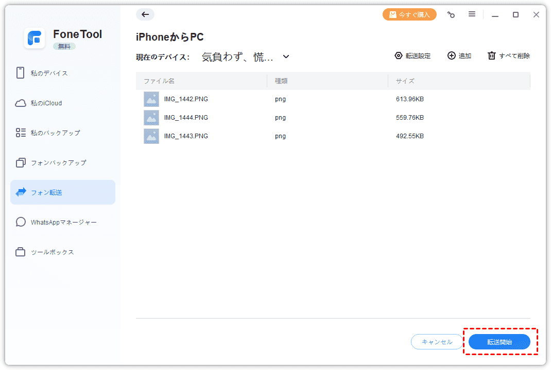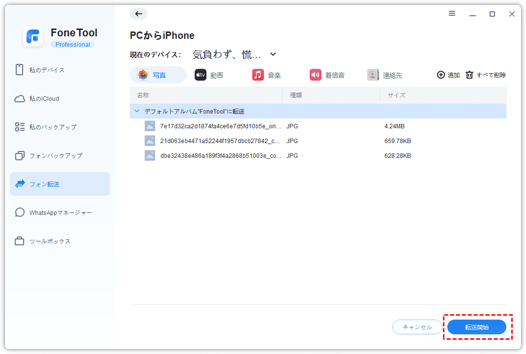 ステップ 3. 転送元デバイスを抜いて、新しいiPhoneを接続>FoneToolで「フォン転送」>「PCからiPhone」を選択>フォルダアイコンをクリック>iCloudからダウンロードした写真を選択>「転送開始」をクリックして、パソコンからiPhoneに写真を送ります。