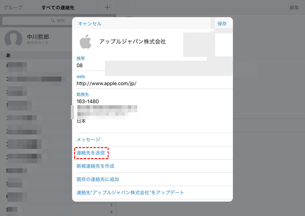 ステップ 3. iPadで:「連絡先」アプリを開き、転送したい連絡先を選択>「連絡先を送信」をタップ>「AirDrop」をタップ>iPhoneの名前を選択します。