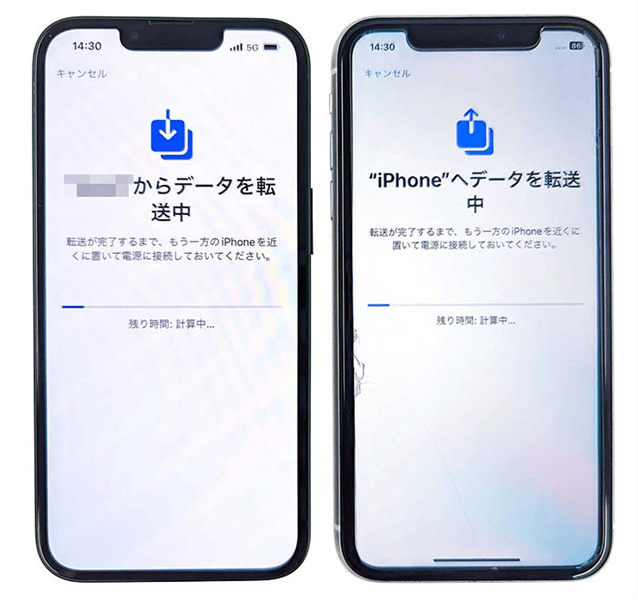 - データ移行中は、両方のiPhoneを電源につなぎ、近づけておいてください。移行時間はデータ量やネットワーク状況で異なります。