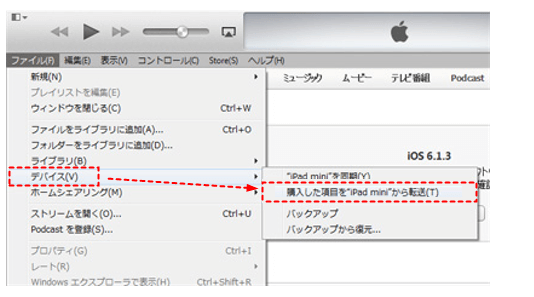 手順 3. 「ファイル」→「デバイス」→「購入した項目を”iPad”から転送」をクリックします。