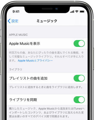 Apple Musicに加入している場合(有料オプション)、「設定」→「同期」で「ライブラリを同期」をオンにすることができます。Apple Musicに加入していない場合は、「シンクライブラリー」オプションは表示されません。