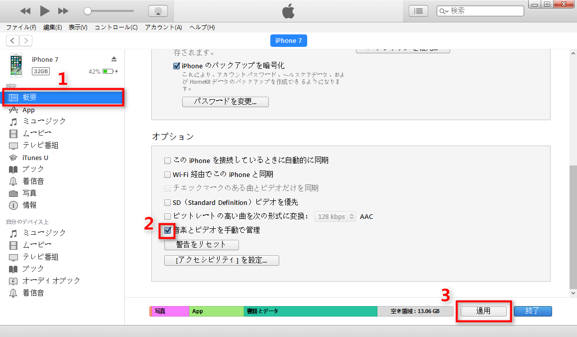 ステップ 4. 「概要」のオプションの「音楽とビデオを手動で管理」にチェックを入れ、「適用」をクリックして変更を保存します。