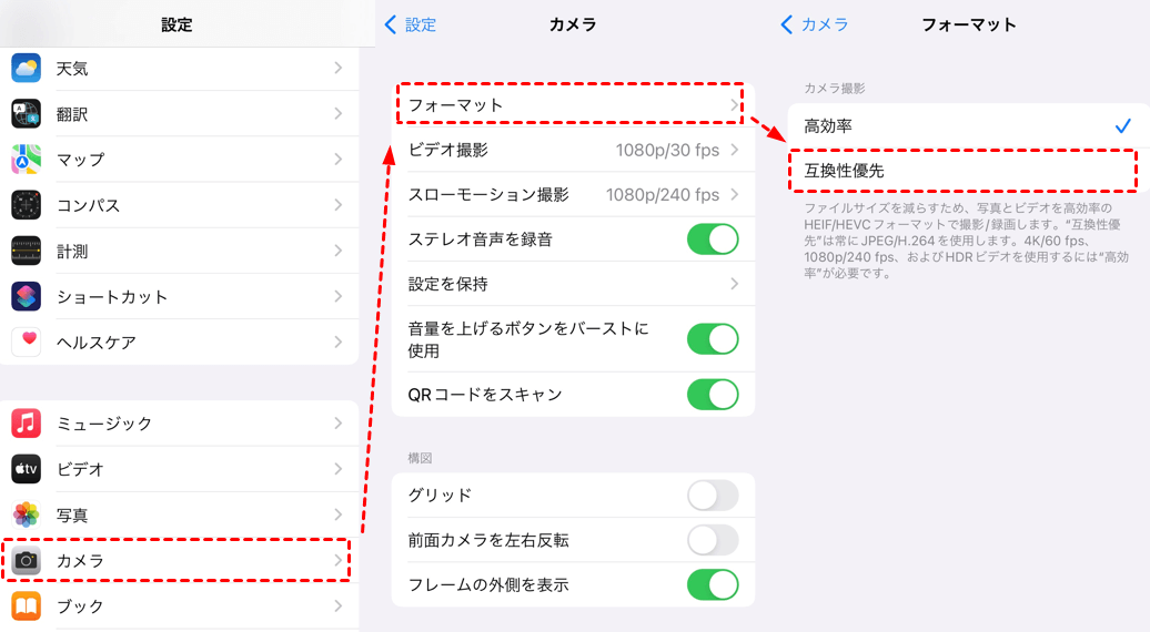 ヒント:HEIC形式で写真を撮った場合、転送された写真が表示と編集可能であることを確認するには、iPhoneの「設定」>「カメラ」>「フォーマット」をタップし、「互換性優先」を選択します。