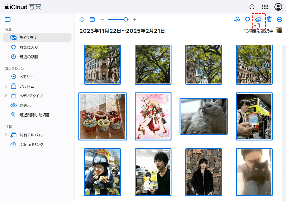 ステップ 2. パソコンでicloud.comにアクセスして、自分のAppleアカウントでサインインします。「写真」をクリックして、移したい写真を選択し、画面上部の「ダウンロード(雲に↓)」ボタンをクリックします。