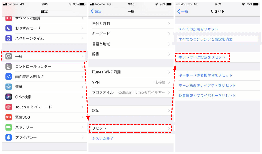 iCloudを使用するにはネットワークが不可欠です。ネットワークに問題がある場合、バックアップ作業が進まない可能性が高いです。Wi-Fiをチェックする以外、iPhoneの「設定」>「一般」>「リセット」>「ネットワーク設定をリセット」で、ネットワークをリセットする必要があるかもしれません。その後、Wi-Fiを接続し、もう一度試してみてください。