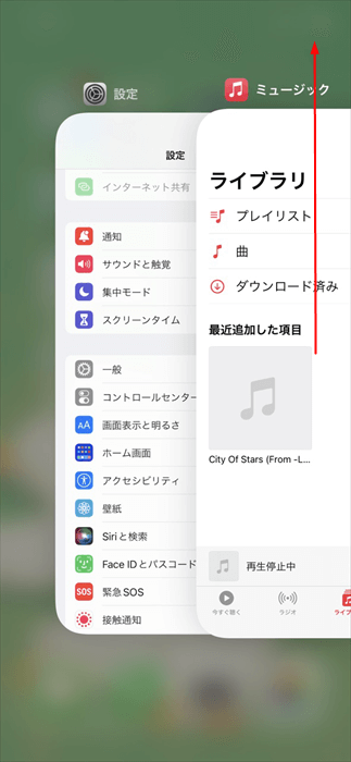 iPhoneで、画面下から上にスワイプしてApp Switcherメニューを開く>ミュージックカードを探す>上にスワイプしてアプリを終了させます。