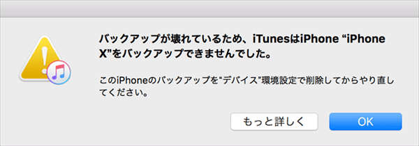 バックアップが壊れているか、復元対象のiPhoneと互換性がないため、iPhone◯◯(←名前です)のiPhoneのバックアップを作成できませんでした。iTunesでこんなことが表示されました。どなたか解決方法を教えてください。同期ができなくて困ってます(´;ω;`)