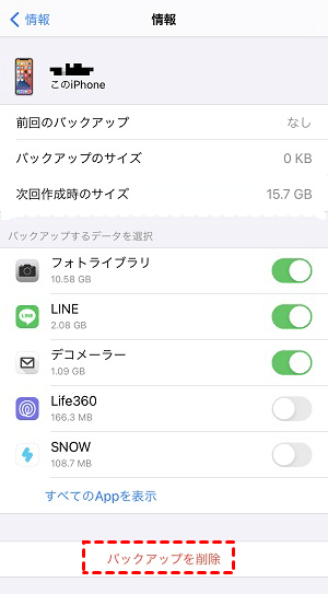 iPhoneの「設定」>自分の名前をタップしてApple IDアカウントを入力>「iCloud」>「ストレージを管理」>「バックアップ」に入る>デバイスを選択し、「バックアップを削除」をタップします。