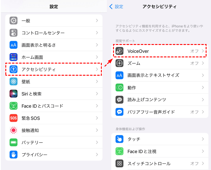 iPhoneのVoiceOverをオフにする:「設定」>「アクセシビリティ」>VoiceOverがオンの場合はオフに切り替えます。